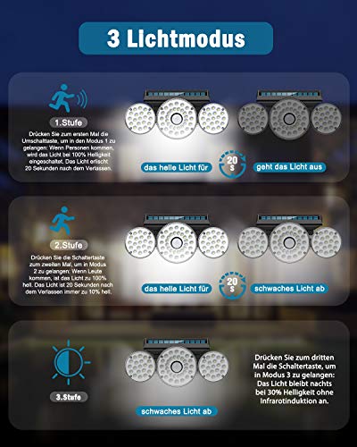 【Bewegingssensor en lichtsensor】Het detectiesysteem is een combinatie van lichtsensor en bewegingssensor. De bijgewerkte PIR-bewegingssensor detecteert personen op een afstand van 3-5 m (als beweging wordt gedetecteerd, wordt de solarlampen automatisch ingeschakeld; er wordt geen beweging gedetecteerd). Drie verschillende verlichtingsmodi, voldoet aan je verschillende eisen.