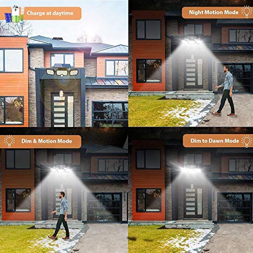 【3 lighting modes】Solar security light has a built-in sensitive light sensor and motion sensor.①Human body induction light mode: The motion sensor automatically turns on and off the light.②Smart mode:keep the lighting state all night, when motion is detected, theBrightness becomes full bright, and after 15 seconds of inactivity, the brightness Diminished brightness.③ Light Permanent on mode: Maintain medium brightness all night, and the sensor does not work.We recommend you to use mode ①