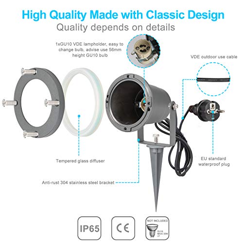 【Tuinspot met Kabel en Stekker】 Tuinlamp met 2M kabel en stekker, u hoeft geen bedradingswerk te doen voor tuinverlichting, bespaar tijd. VDE standaard kabels en stekkers maken de buitenspot geschikt voor buitengebruik. Opmerking: de buitenste stekker is IP44 waterdicht, stel de stekker niet volledig bloot aan regen.