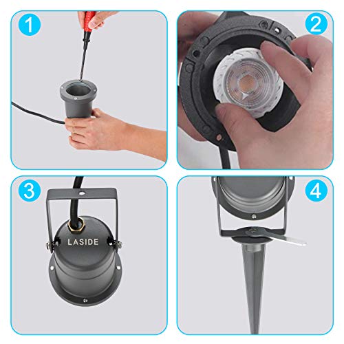 【Eenvoudige Montage en Vervanging van de Gloeilampen】 Monteer de beugel en grondpen met schroeven (meegeleverd) aan de verlichting tuin, steek de gloeilampen (1x GU10) in en steek de stekker in het stopcontact. Afgewerkt! Draai de schroeven aan de bovenzijde van de padverlichting los en vervang vervolgens eenvoudig de lampen. Aanbevolen maat van de GU10-lamp: 56 mm