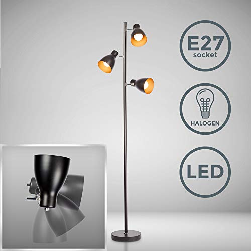 3-flame metalen staande lamp in matzwarte retrolook. 3 draaibare en draaibare lampenkappen met gouden interieurkleur vormen een waardevol totaalproduct.