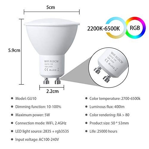 🟨 [Energiezuinig] – 5W, 400LM GU10 Wi-Fi-lampen. Bespaart tot 90% energieverbruik in vergelijking met normale gloeilampen en gaat meer dan 25.000 uur mee. Geen neuriën, geen flikkering. Langer meegaan en energie besparen.