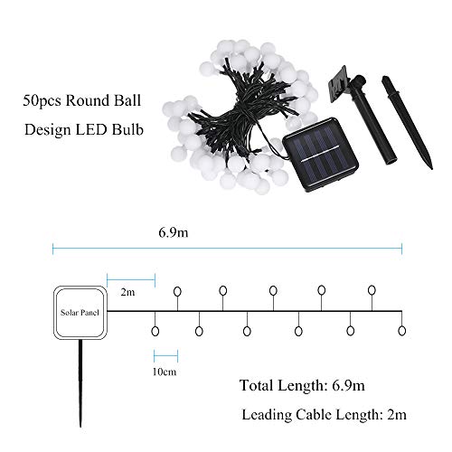  6,9 m meerkleurige lichtketting op zonne-energie Het lichtsnoer op zonne-energie heeft 50 leds. Het oppervlak van de bol is gemaakt van mat glas-kunststof. De diameter van de bol is slechts 19 mm, miniformaat en mooi.