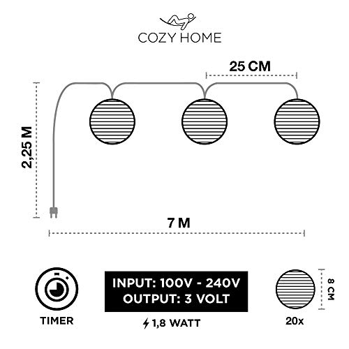 Specificaties: CozyHome Led-lampion lichtketting voor buiten, met timer, 7 meter, met netstekker, werkt niet op batterijen, ook voor…