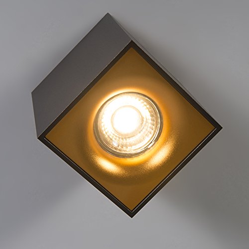 Super strakke vierkante design spot volledig gemaakt van staal en heeft een luxe kwalitatieve uitstraling. Hij is prachtig afgewerkt met een zwarte kleur aan de buitenkant, en vanbinnen goud: dat creëert een warm lichteffect in huis.